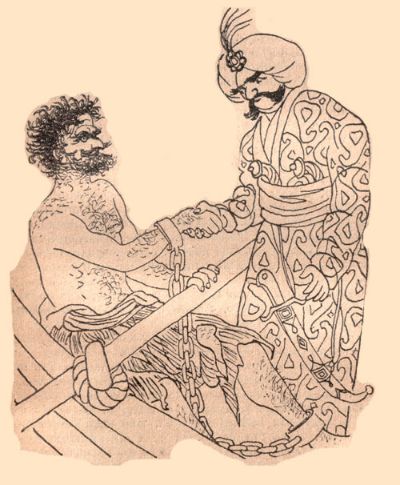 полуголого, с веслом в руках, прикованного к сиденью.
