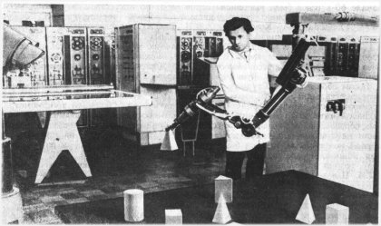 Опыт, полученный при создании и использовании устройств ввода-вывода изображений, позволил разработать первый в СССР стенд моделирования интеллектуальных роботов типа глаз-рука (В.И. Рыбак, Г.Л. Гиммельфарб, В.Б. Марченко и др.). В состав стенда вошли ЭВМ БЭСМ-6, связанная с ней телевизионная система ввода изображений в ЭВМ и электромеханический манипулятор с шестью степенями подвижности, подсоединенный к ЭВМ БЭСМ-6 через управляющую мини-ЭВМ М-6000. В.М. Глущков проявил большой интерес к этим работам, поскольку считал робототехнику одним из важнейших направлений практического использования методов и средств искусственного интеллекта. На стенде были впервые в СССР выполнены работы по автоматическому описанию пространственных сцен, составленных из простых по форме объектов, и управлению манипулятором на основе полученного описания (70-е годы)".